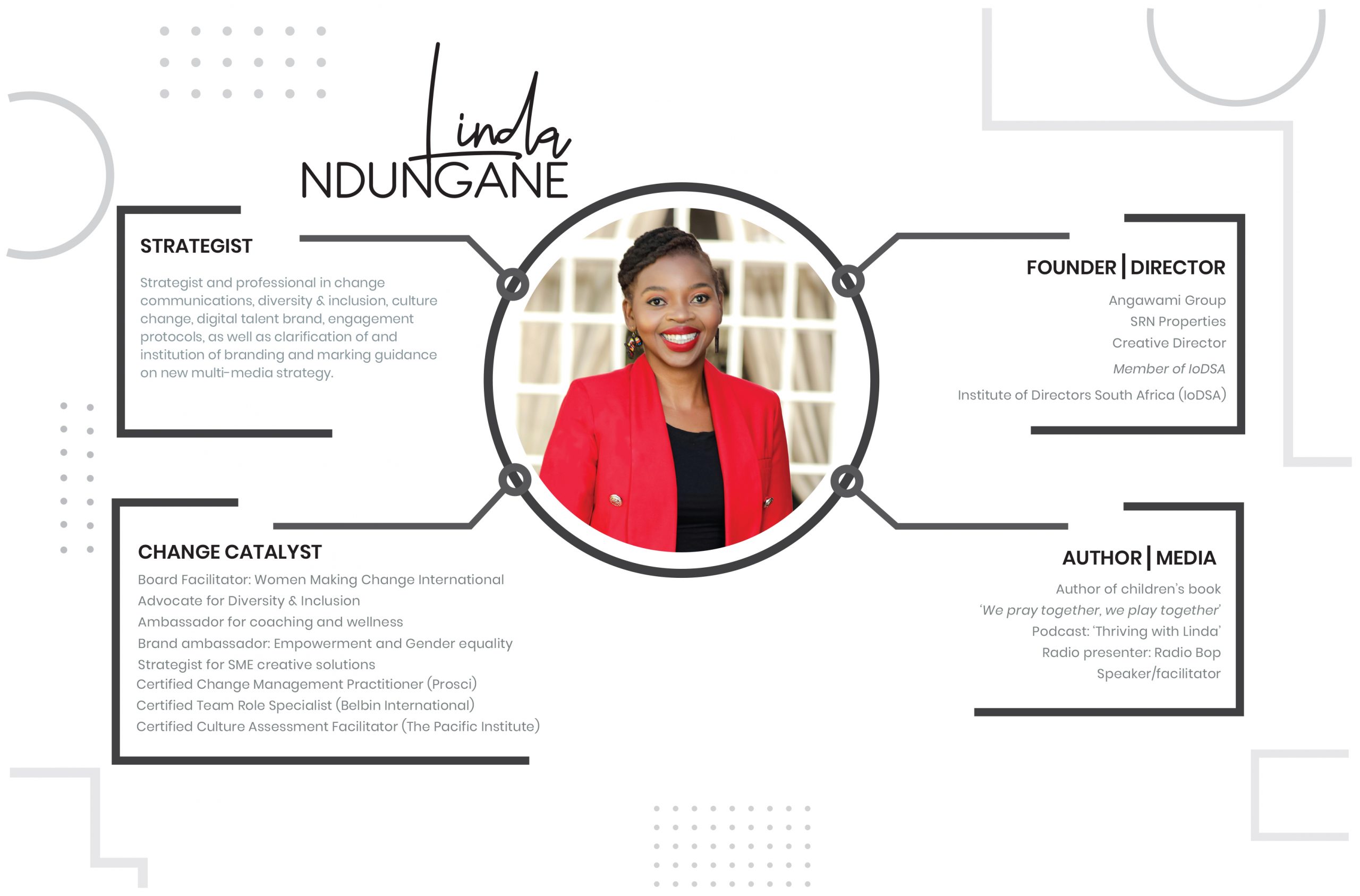 She is the founder and creative director of Angawami Group. Linda Ndungane is known for her corporate work in change and transformation management. Her work has mostly focused on creative change communications through the implementation of creative strategies.